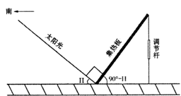 5、单选题 太阳能热水器集热板与地面的夹角可调节。为使集热效率达到最高,应保持正午太阳光与集热板垂直,若当地的正午太阳高度为H,则集热板与地面的夹角应为900-H,如下图所示。读图回答下列问题。