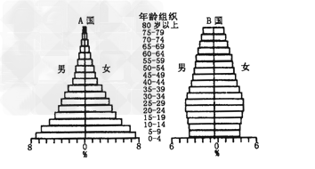 5、单选题 如图所示若A 、B 国人口按现在趋势发展,下列说法正确的是 ①儿童占有较高人口百分比的是A国 ②B国就业人口主要从事第一产业的工作 ③若干年后B国面临的问题主要是就业困难 ④20年后,A国面临的问题主要是人均资源少