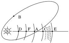 (2)图中扁长椭圆轨道是彗星轨道,请在B处画出彗尾和C天体绕日公转方向。(4分)