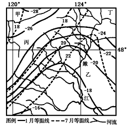 4、单选题 下图为“我国东北部地区1、7月等温线分布示意图”。回答1—3题。
