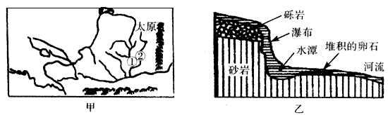 2、综合题 某校兴趣小组查阅资料时发现,在甲图中①处有一瀑布,有史为证,此瀑布“激流翻滚,惊涛怒吼,其声方圆十里可闻,其形恰如巨壶倒悬,场面极为壮观”。然而同学们在秋游时,并未欣赏到如此壮观的场面。读图回答下列各题。