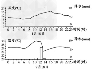 1、单选题 读某地1月18日和7月18日气温(曲线)和降水(柱状)日变化图回答1、2题。