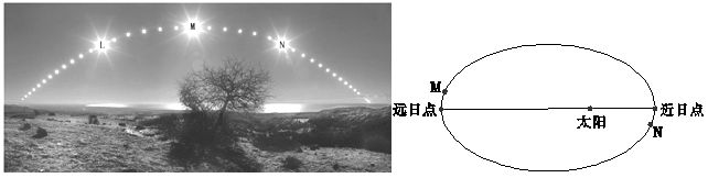 4、单选题 图为某地天文爱好者在一天中连续拍摄的太阳视运动轨迹,拍摄日期为北半球夏至日且M位于正南,据此结合读图回答下列小题。