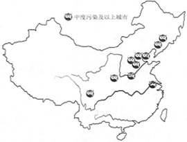 2013年1月11日开始,受雾霾天气的影响,我国中东部地区多个城市出现严重的大气污染。下图为此时段我国大气中度污染及以上城市分布示意图。