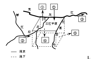 小题2:“北大荒”变为“北大仓”是沼泽湿地变成耕地的过程,沼泽减少,水面减少蒸发减少,①减少;这一地区的降水主要是来自海洋水汽不是全靠当地水汽蒸发,②不全是人类活动影响;变成耕地河流径流量③减少,水面变成旱地下渗④当然会减少;⑤地下径流主要有潜水和承压水影响因素较多,人类活动不是最显著的。