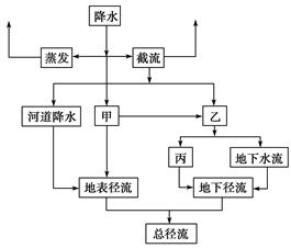 小题1:图中显示甲和河道降水是地表径流的来源,而地表径流包括河道径流和坡面径流,则甲是坡面径流;丙是地下径流的组成部分,而地下径流包括地下河的径流和土壤中的径流,故丙为壤中流;乙是地下径流的来源,必然是地表水的下渗环节。
