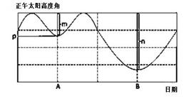 5、综合题 读“北半球某纬度正午太阳高度的年变化图”。若图中m、n数值相差20,回答下列问题。