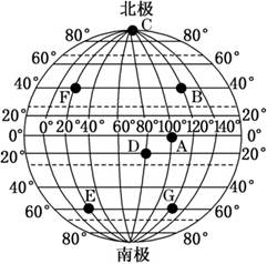 (3)相同纬度的点线速度相同,G点与E点线速度和角速度都相同。F为20°E,B为120°E,相隔100°,相隔15°相差一小时,1度四分钟,需6小时40分