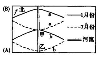 5、单选题 右图为我国塔里木盆地边缘某河流附近1月份和7月份潜水面等高线,等高距为1.5米。回答25~26题。
