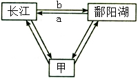1.甲代表的水体是2.箭头b代表的现象一般发生在3.近年来,鄱阳湖区实行退耕还湖,由此导致的箭头a、b流量的变化趋势是