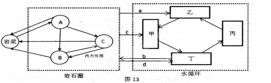 2、填空题 图13表示岩石圈与水循环的关系。A、B、c表示三大类岩石,甲、乙、丙、丁为海陆间循环各环节,箭头a、b、c、d为岩石圈与水循环各环节的作用,读图回答23~24题。