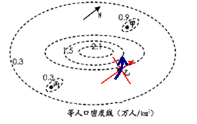 1.根据等值线弯曲部位——“凸高为低,凸低为高”和等值线局部闭合——“大于大的,小于小的”等规律可以知道:人口密度向外围减少,说明建筑物高度也是向外围递减的;?甲处人口在等密度线处出现峰值说明这地方人口比周围密集,有可能出现卫星城;而丙处正好与甲处相反,人口密度突然出现减少,有可能是农业区,根据图中的指向标,在该地东北—西南方向上等值线向低处凸,说明这个方向上人口密度较大。
