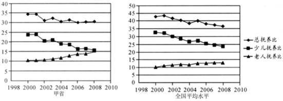 C.2008年甲省的少儿抚养比明显高于全国平均水平
