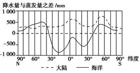 2、单选题 读地球上大陆和海洋各纬度带的水平衡(降水量减去蒸发量)图,回答小题。