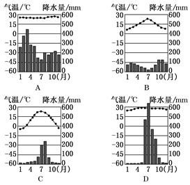 本题解析:根据所学知识可知广州应该为亚热带季风气候,所以其全年平均气温<20℃,最冷月均温>0℃,且雨热同期,夏季多雨。所以D符合。