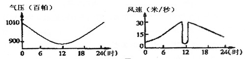 2、单选题 该图是我国某天气系统在某地过境时的气压与风速随时间的变化规律示意图,分析判断回答7-8题。