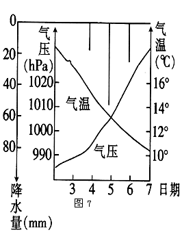 3、单选题 据右图7南通5月5日前后几天的天气变化资料统计图7,回答题: