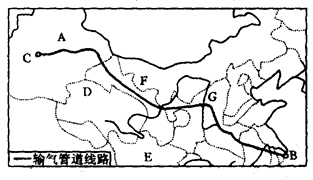 (3)西气东输主干管道西起轮南油气田,它位于图A所表示的___________自治区,东到B___________市。(2分)