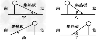 1、单选题 太阳能热水器绿色环保,因此得到广泛的应用,为了使太阳能热水器发挥最大功效,太阳能集热板应尽量和太阳光线垂直。某地理兴趣小组对北京(116°E,39°N)、石家庄(114°E,38°N)、悉尼(151°E,33°S) 、墨尔本(144°E,37°S)四地的太阳能热水器集热板的安装角度进行了研究,并绘制了四幅图。据此完成第1~2题。