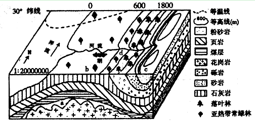 ①a处可能为变质岩 ②此季节,b地区温和湿润 ③c处山地成因为背斜成山 ④若d地植被遭到破坏,河流三角洲会减缓向海洋延伸的速度