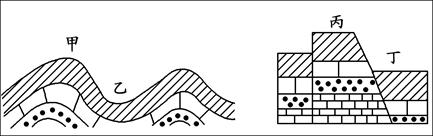 小题2:在图中甲—丁四种地质构造中,可能找到石油和天然气资源的是(? )
