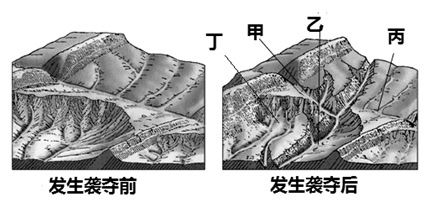 ③弯曲河道的河流袭夺平直河道的河流;④河谷地势较低的河流袭夺河谷地势高的河流