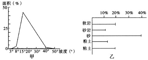 5、综合题  下图中的甲为某滑坡区域坡度面积频率分布图,乙为某滑坡区域土质分布图。读图回答下列问题。