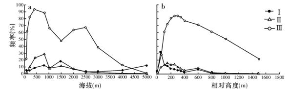 1、单选题  读我国不同海拔(a)、相对高度(下滑坡和泥石流灾害的频率分布,I为分布频率、II为发生频率、III为频率比数,读图可知?(?)