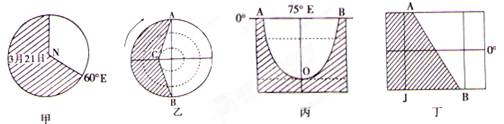 2、综合题 比较下面四幅图(注:乙、丙、丁三图中,阴影区为黑夜),完成下列问题。(10分)