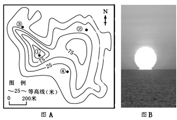 【小题2】地势越高,位置越靠东,越向看到日出,①地地势高,②地位置最靠东,无视野阻挡,看到日出早;③④位于同一海拔高度,③地无阻挡,④地东面有山脊阻挡,故④最晚看见日出。
