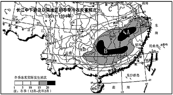 3、单选题 下图为(1951~1994年)我国部分地区的冬季冷冻灾害频次图,读图回答下题。