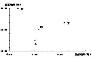 小题1:从图中可以读出甲乙丙丁的日出和日落时间,这样来确定四地的昼长。甲地昼长约为15小时,乙地昼长约为13.5小时,丙地约为14小时,丁地约为12.5小时,这四个地点都是昼长夜短,都位于北半球,因为太阳直射半球纬度越高昼越长,所以纬度由高到低依次为甲丙乙丁。