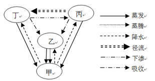小题1:由图中右侧的环节可以判断,甲、乙、丙、丁代表的圈层分别为大气圈、生物圈、岩石圈、水圈。