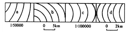 2、单选题 下面四幅图中等高距相同,则a、b、c、d四处坡度由大到小排列正确的是