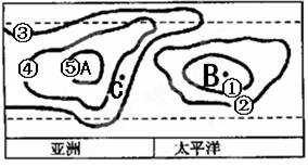 1.若图中五条等压线的数值分别是1000、1008、1016、1024、1032,那么等压线②④的气压值分别是2.图中亚洲东部C点的风向是