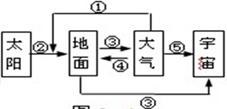 5、单选题 下图中各箭头及其代表符号①②③④⑤表示太阳、地面、大气、宇宙空间之间的热力作用,其中包括太阳辐射、地面辐射、大气辐射、大气逆辐射、削弱作用(吸收、反射和散射),完成下列问题。