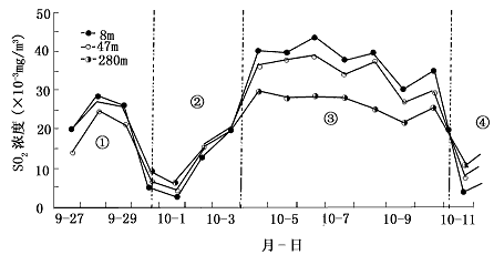 4、单选题 下图表示某时期内我国北方某地上空不同高度SO2浓度的变化。可能出现冷空气入侵的两个阶段是