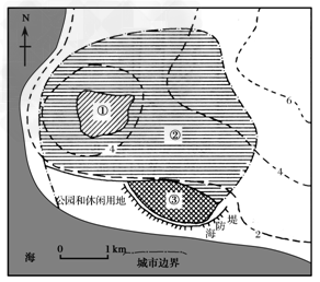 4、单选题 读“欧洲西部某沿海城镇功能分区图”,图中的虚线为等高线(单位:米),海防堤是为应对海平面上升1米而设计的。据此回答下面1~3题。