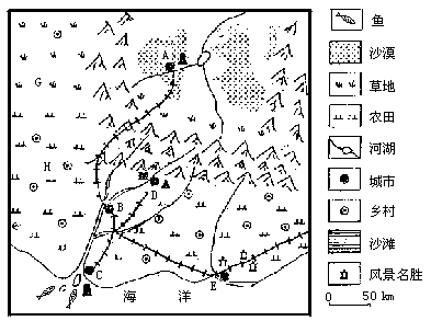 本题解析:此题综合考查城市区位因素,需要一定的综合分析、归纳的能力,尤其要熟记一些区位因素对城市形成和发展的影响。如B城位于河流交汇处,C城位于河口,均容易发育成城市;另外还必须充分利用图上所示的信息去进行思维。