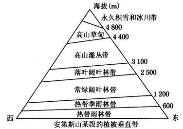 5、综合题  下图为“安第斯山某段的植被垂直带示意图”,读图回答下列问题。
