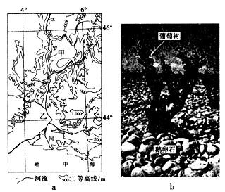 ? 葡萄的糖分含量越高,酿制出的葡萄酒酒精度越高。葡萄生长过程中,特别是成熟期的光照及昼夜温差与其糖分积累呈正相关。下图a中甲、乙两地均为优质葡萄产地。图b为乙地典型的葡萄种植园景观。世界上酒精度最高(16.2度)的优质葡萄酒就是使用乙地及其附近所产的葡萄酿制而成的。