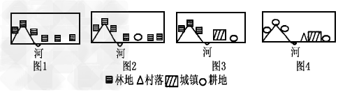 1、单选题 下图为一组剖面示意图,反映了我国华北某地区土地利用状况由图1→图4时期的历史变化过程。(图1时期→图4时期气候变化甚微,可忽略不计;图中河流断面位于中游处。)回答1-2题。?
