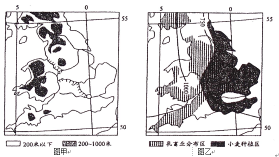 (1)读图乙,英国小麦种植业分布在年降水量较少,年降水量750mm以下的东部平原地区。乳畜业分布在年降水量较多,年降水量750mm以上的西部低山丘陵和沿海平原地区。因为西部位于西风带的迎风坡,降水量较多,日照较少,有利于多汁牧草生长,适合发展畜牧业。而东部位于西风带的背风坡,降水较少,日照较多,适合小麦生长。