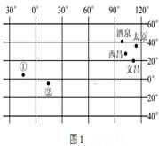 1、单选题  北京时间2012年10月14日11时25分,我国在太原卫星发射中心用长征二号丙运载火箭,采用一箭双星模式,成功将实践九号A/B卫星送入预定轨道。我国目前已经有酒泉(北纬40.965371°N,东经100.283658°E)、太原(38.1°N,111.5°E)、西昌(28. 2°N,102°E)3个卫星发射基地,文昌(19.3°N,109.8°E)卫星发射基地正在建设中。读地球公转示意图和我国卫星发射中心位置图,回答题。
