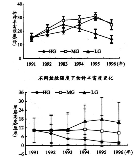 材料二? 1 99 1~1 996年,我国某研究机构在科尔沁沙地进行了放牧试验,试验分为3个放牧强度进行,即重牧(HG)(6只羊/公顷)、中牧(MG)(4只羊/公顷)、轻牧(LG)(2只羊/公顷),主要研究不同放牧强度对草原植被的影响。下两图为根据实验结果绘制的示意图。