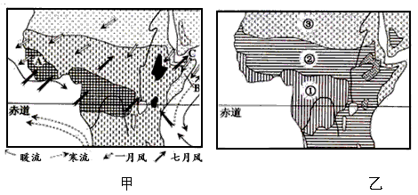 (1)比较图甲中A、B两地气候特点的主要差异并根据图中信息分析其差异的原因。