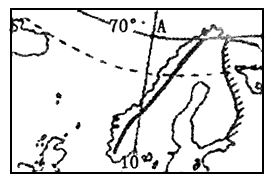 2、单选题 下图中晨昏线与纬线切于A点,且A点附近可以看到极光。据图完成1—2题。