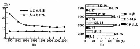 材料2:图1我国某省“人口出生率、死亡率变化”和图2“人口年龄结构变化”。