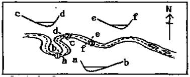 3、单选题  下图是北半球某段河流河道形态和断面图,虚线表示河流主航道中心线。读图完成下列问题。