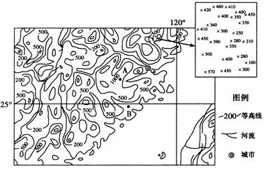 本题解析:本题考查我国的区域地理和等高线的综合分析。第(1)题,由图示可知,该地为东南丘陵地区,降水丰富,流水侵蚀作用强烈。B地位于沿海平原地区,地形雨少于处于山地迎风坡的A地,同时位于台湾山脉雨影区,降水较少。第(2)题,从图中找出400m或者400m最接近的点,然后大体判断400m等高线的位置,用平滑的曲线连接。